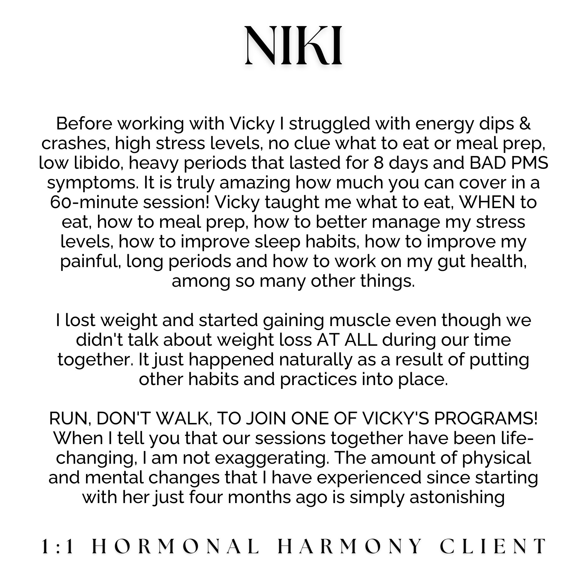 This is for the person who’s ready for some quick wins and to finally get some answers about their health. You’ll walk away understanding the ins and outs of your hormone health and a plan to implement all of the changes that we’ve started together long after you’ve graduated from the program.