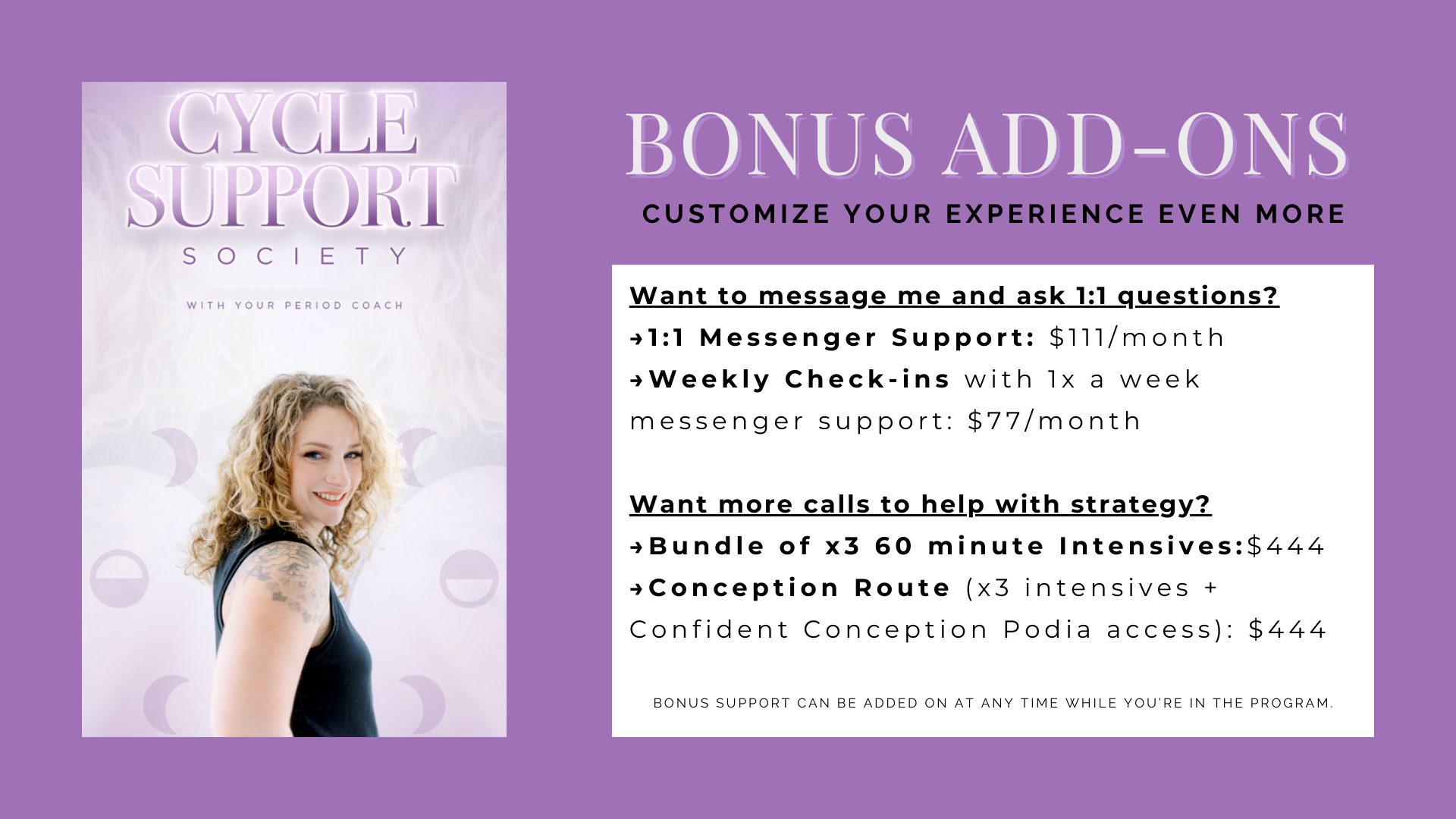 The Cycle Support Society has limited spots available on a first come, first served basis so every single woman gets an intimate, personalized coaching experience that combines all of the BEST parts of a private 1:1 coaching package in the ultimate one-stop-shop community where you'll get the support you've been missing to have the cycle of your dreams.